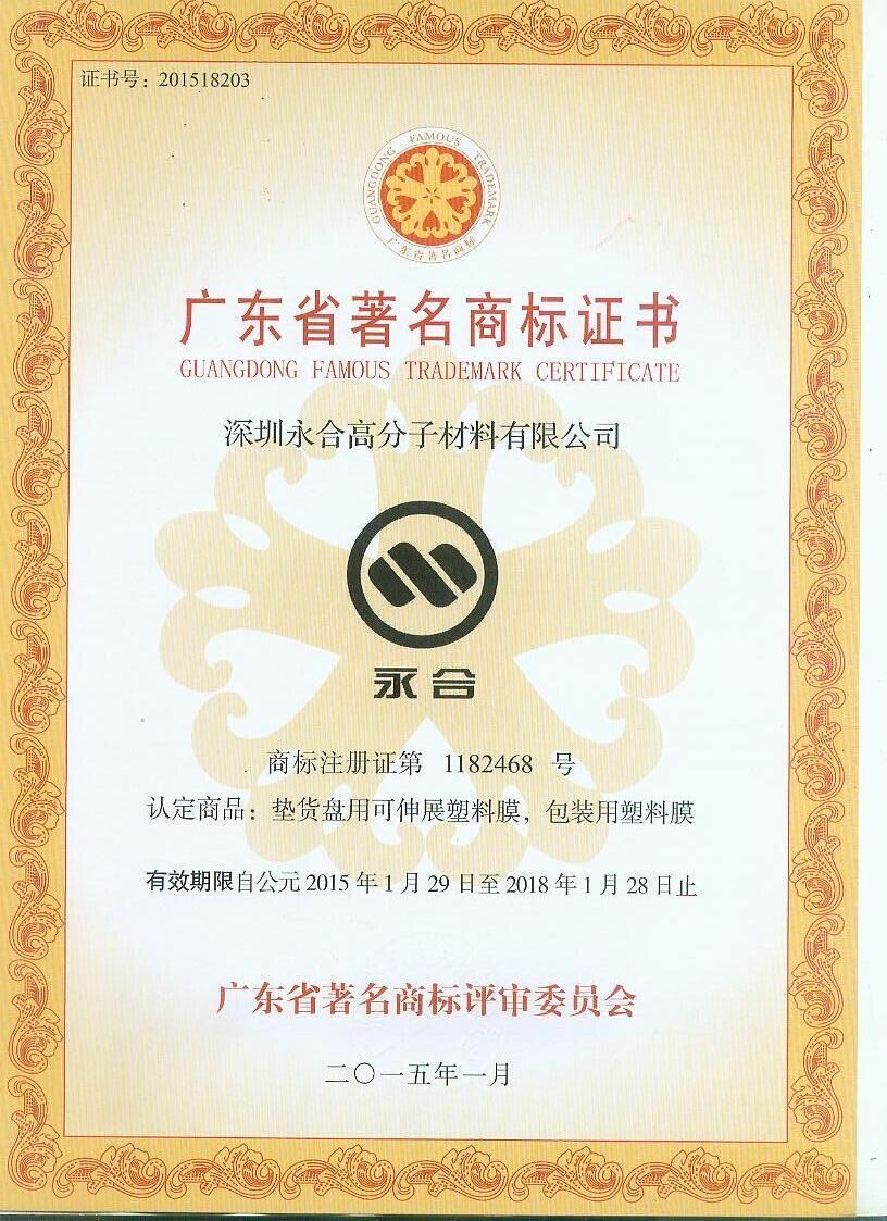 2015年1月份,“永合”商标,经广东省著名商标评审委员会评定并颁发的《广东省著名商标证书》,已正式成为广东省著名商标。